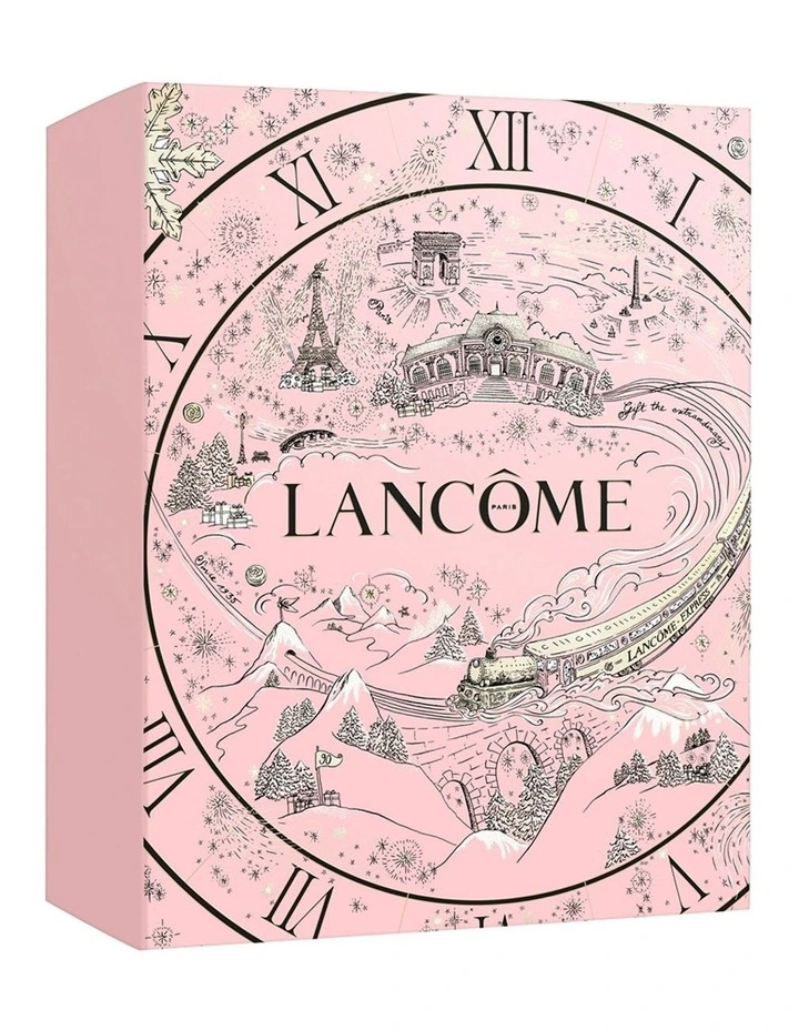 This Holiday season, embark on an extraordinary journey from Paris to Happiness, our brand destination since 1935, and celebrate 90 years of magic with our luxurious Advent Calendar. Designed by French artist Safia Ouares in signature Lancôme pink, this exquisite suitcase Advent Calendar opens up to unveil to unveil an enchanting train station decor mastered by its majestic clock.